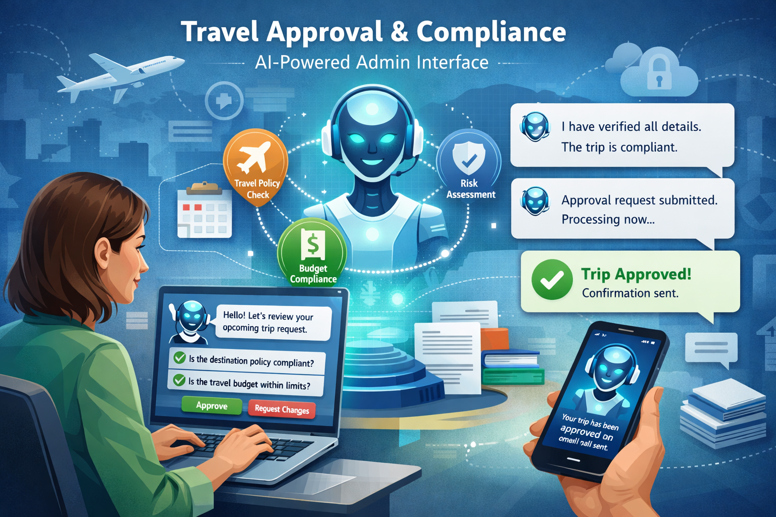 • Our AI understands the intent behind the request, matches it against your company's travel policies, and delivers approval decisions in seconds. No dropdowns to navigate, no policy documents to interpret, no waiting on email chains. Just a natural conversation that gets employees on their way.